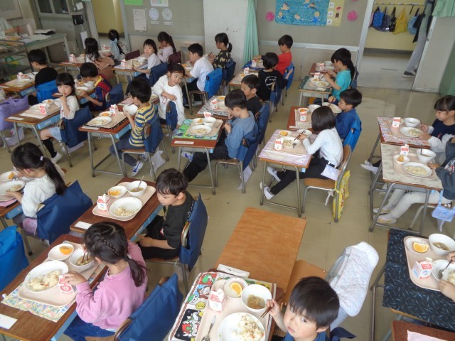 今日から1年生の給食が始まりました。4時間目に栄養士・調理員から給食についての話を聞きました。苦手なものにもチャレンジして、色々なものをたくさん食べられるようになることを期待します。