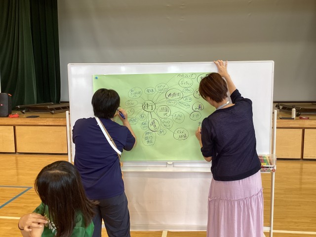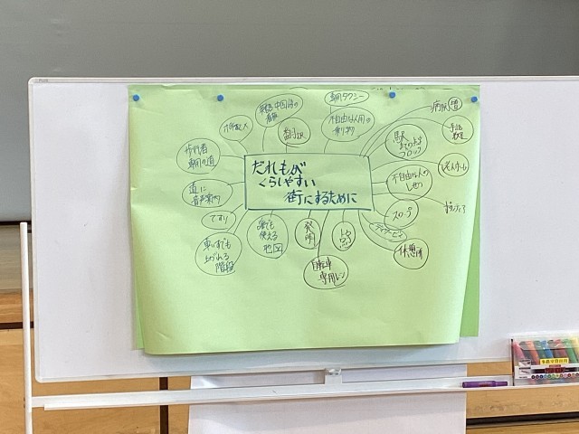 初回の今日は学年で集まり、誰もが暮らしやすい街にするために必要なものは何か、アイデアを出し合いました。