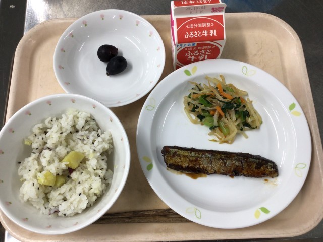 さつまいもごはん 牛乳 さんまのしょうが煮 しらすと小松菜のあえもの くだもの(巨峰)