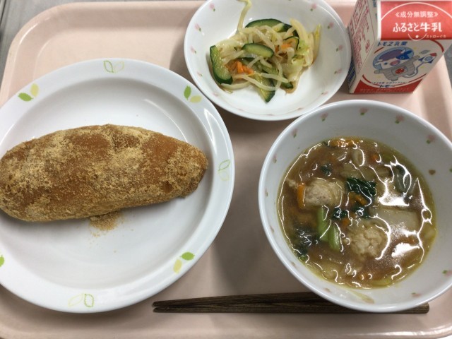 きなこあげぱん 牛乳 肉だんご入り春雨スープ 中華サラダ