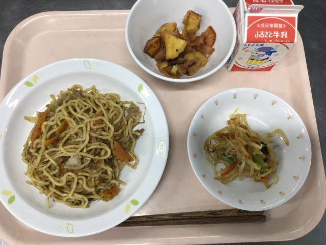 ソース焼きそば 牛乳 ナムル りんご大学芋