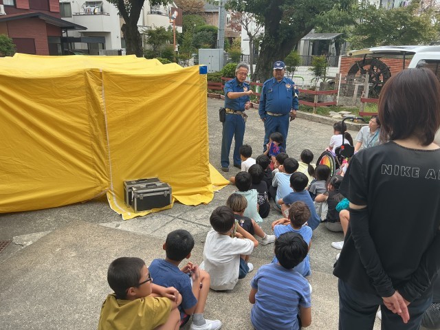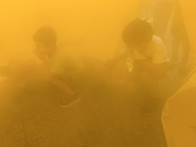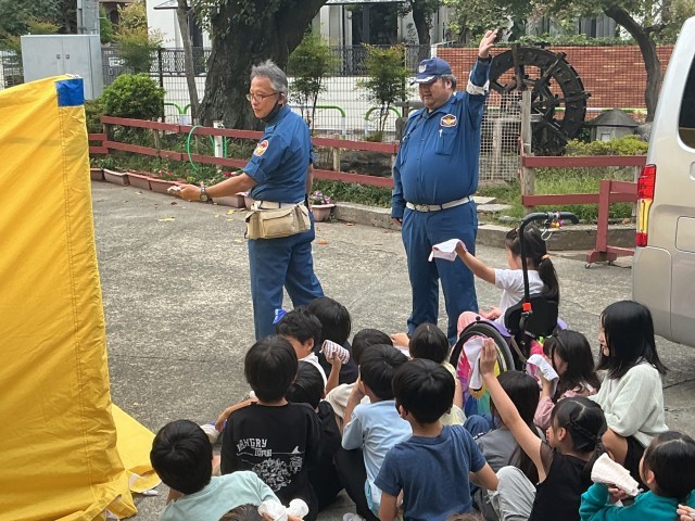 秋らしい日も増えてきましたが、この季節から増えてくる災害が火災です。火事のときに備えて、本日全校で避難訓練が、また3年生はその後に煙体験を行いました。消防の方から、火災時の避難で大切なことについてお話をうかがいました。①口と鼻を布等で押さえること②姿勢は低くして避難すること③壁をつたって避難することを確認し、いざ体験へ。教わったことを胸に、テントの中へ入ります。思った以上に視界がないことや、体験用の煙でも息苦しいことを体験した子どもたち。「言われたことを確認しながら(テントに)入ったから、落ち着いて行動できた。」と感想を持つ子もいました。実際、災害に遭遇したときにも、今日教わったことを思い出して、一人一人が命を守る行動ができるといいと思います。