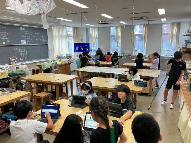 図工では真っ直ぐな木や曲がった木を組み合わせて形を作りました。船の帆のような形やテントのような形でカラフルで素敵です。ロイロノートを使って学んだことを振り返りました。振り返りが今年度の研究テーマです。早く終わった子は掃除をしていて気持ちがいいですね。