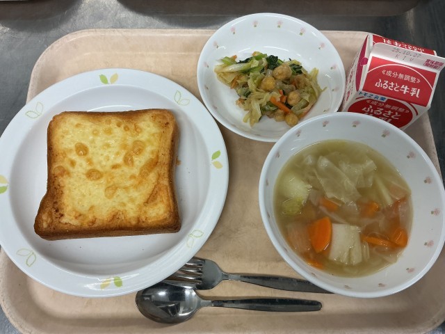 ガーリックチーズトースト 牛乳 ポトフ フライドビーンズサラダ