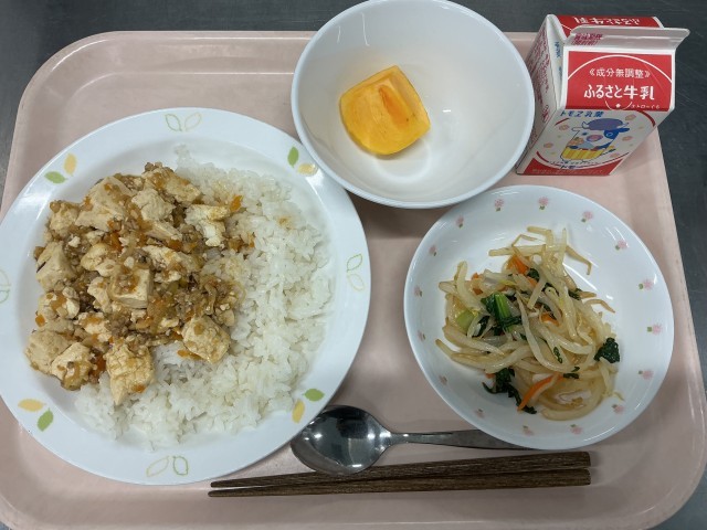 麻婆豆腐丼 牛乳 もやしの中華あえ 柿