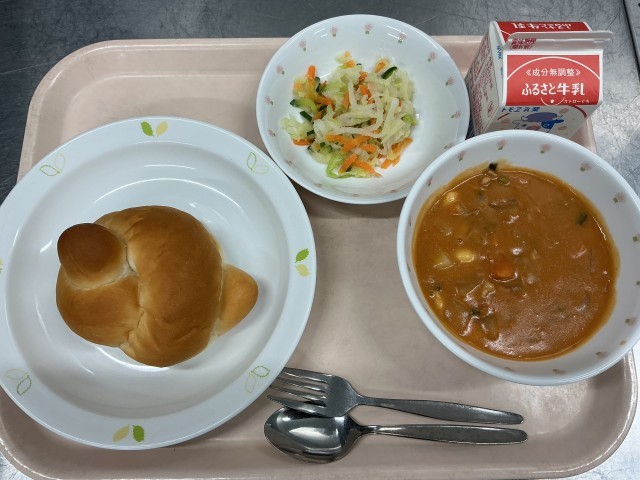【読書旬間こんだて】ミルクパン 牛乳 トマトのすうぷ グリーンサラダ