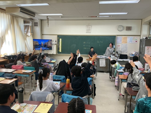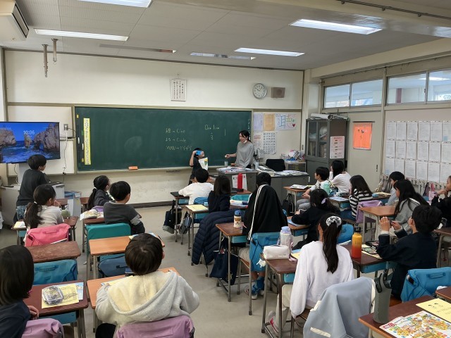 出題者役の児童は、くじで引いた小文字のアルファベットについて、どんな形を組み合わせたら小文字のアルファベットになるかを想像して英語でクイズを出題することに挑戦しました。回答役の児童は、そのヒントを聞きながらクイズに答えます。これらを繰り返すことで、学級全体で、小文字のアルファベットの形に自然と慣れ親しみました。