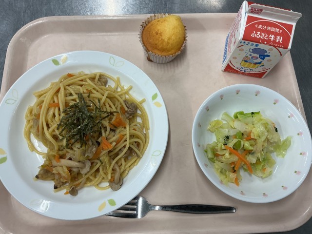 【読書旬間こんだて】和風スパゲティ 牛乳 キャベツサラダ ぐりとぐらのかすてら