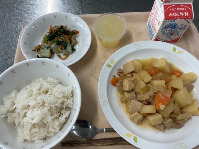 麦ごはん 牛乳 肉じゃがうま煮 白菜と小松菜ののりあえ りんごゼリー