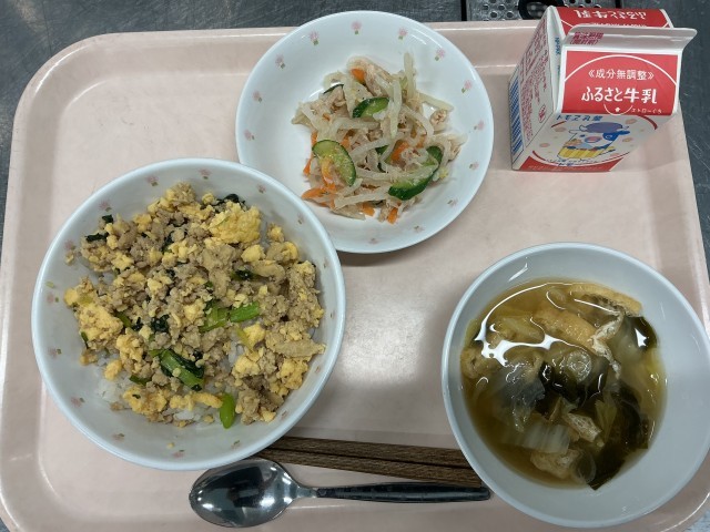 三色丼 牛乳 大根とツナのサラダ みそ汁
