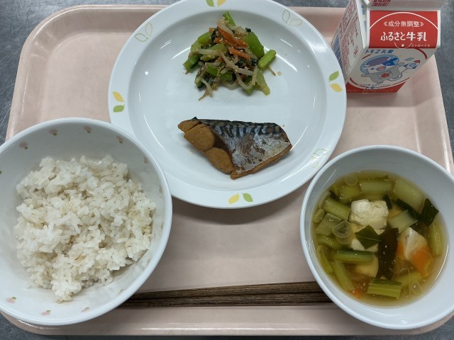 麦ごはん 牛乳 さばのみそ煮 ごまあえ すまし汁