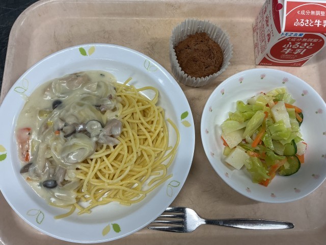 きのことベーコンのクリームスパゲティ 牛乳 ポテト入りフレンチサラダ おからマフィン