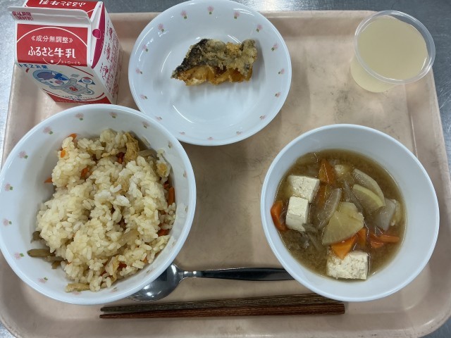 冬のたきこみごはん 牛乳 白身魚のからあげ 豚汁 ゆずゼリー