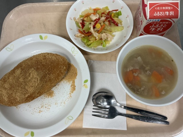 きなこあげパン 牛乳 蒸し鶏の野菜ソース ABCスープ