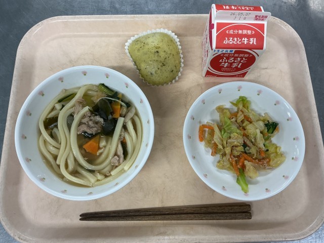 わかめうどん 牛乳 野菜のごまあえ お茶の葉蒸しパン