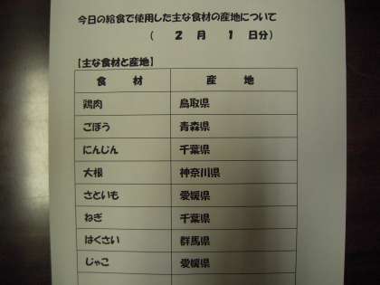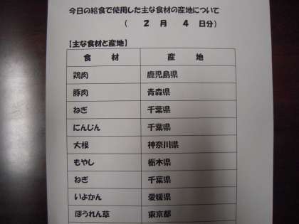2月1日、4日の給食食材の産地