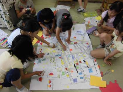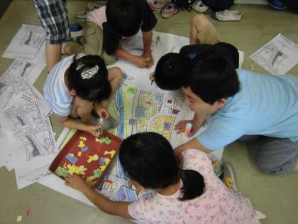 学校の周りを歩いてまわり、まちたんけんをしました。住宅やお店、公園や駐車場、学校などをどのように表すか決めてから、グループに分かれて絵地図を作りました。色を塗る子、画用紙を切り抜く子、それを張る子と分担して上手に作業をしていました。