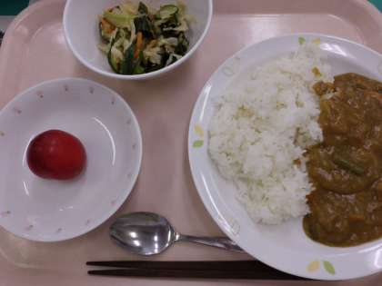 夏野菜のカレーライス・牛乳・わかめサラダ・くだもの