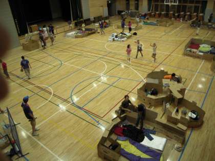 おやじの会主催のお泊まり体験会が、14日〜15日に千歳小学校で行われました。体育館では、ダンボールハウスを作り、お泊まり体験を実施しました。でも、皆興奮してほとんど寝ていないようでした。