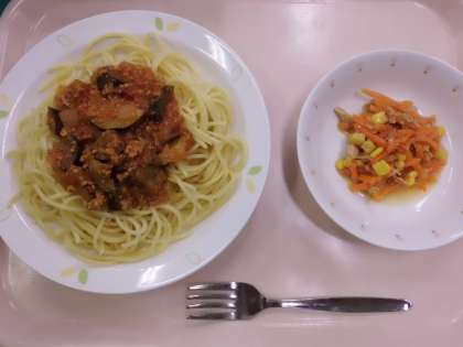 なすとトマトのスパゲティ・牛乳・にんじんサラダ