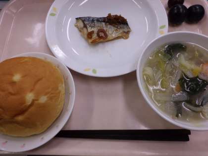 パインパン・牛乳・魚の南蛮焼き・ベーコンと野菜のスープ煮・くだもの