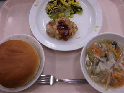 ミルクパン・牛乳・アップルチーズハンバーグ・青菜とコーンのソテー・
