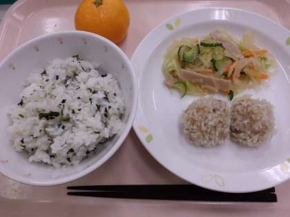 わかめごはん・牛乳・珍珠丸子・春雨サラダ・くだもの