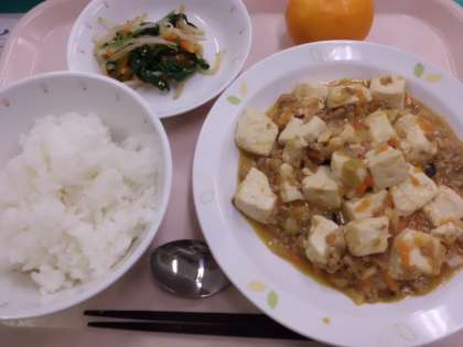 ごはん・牛乳・麻婆豆腐・ナムル・くだもの