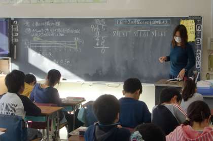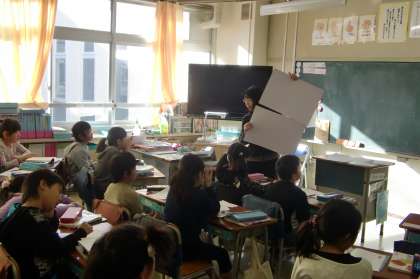 4年3組は国語。新聞づくりの台紙をどうするか、話し合っています。