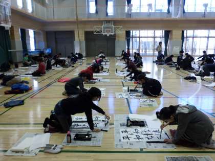 体育館で6年全員で、心を静めて「平和な春」を書きました。