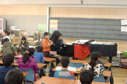 3年4組は第一音楽室でリコーダーのテストを二人ずつ受けています。