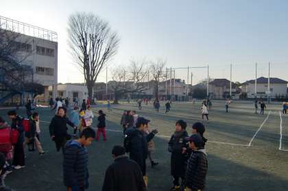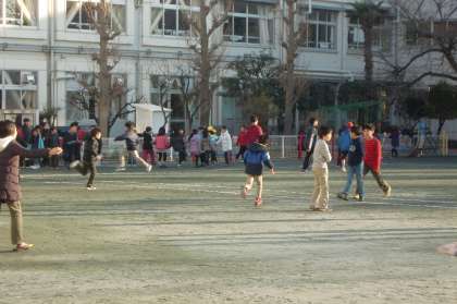 朝、教室に入るのを待っている子たちと校庭で遊んでいる子たちの姿です。