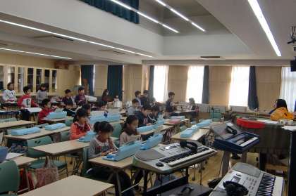 4年1組は音楽。ビートルズの名曲「プリーズ・プリーズ・ミー」の合奏をしています。
