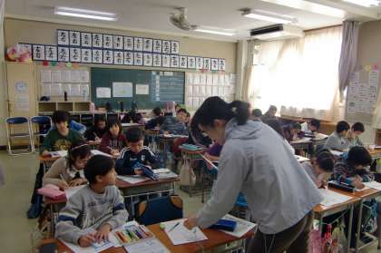 4年2組は社会。「島の人々の暮らし」の学習で、それぞれが調べたことをワークシートにまとめています。