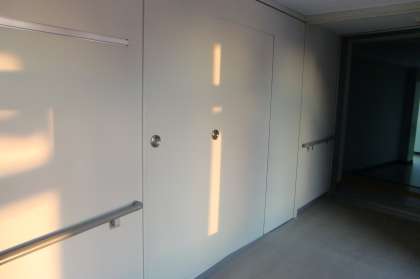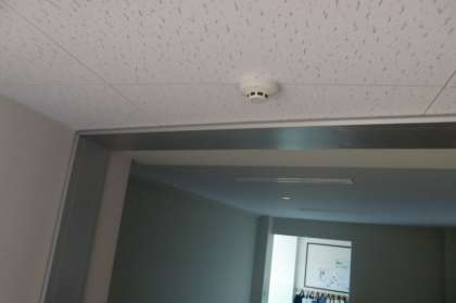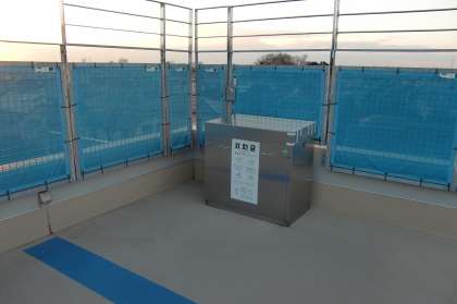写真は新くじらドームおく上のプールにもある救助ぶくろと、同じく3階の渡りろう下にあるかんちきにはんのうして閉まる防火とびらです。ほかにも校内には防火とびらや防火シャッターがあるので、発見したらそっと教えてくださいね。(副校長)