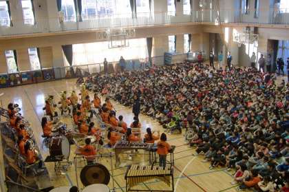 パート別の楽器紹介の後、「ディズニーランド50周年セレブレーション」を演奏しました。最後に「星条旗よ永遠なれ」の演奏にのって体育館から退場しました。