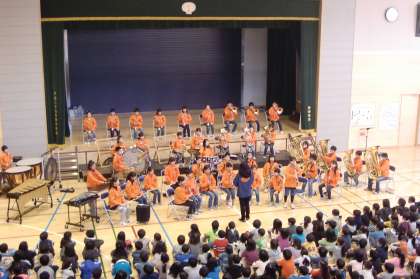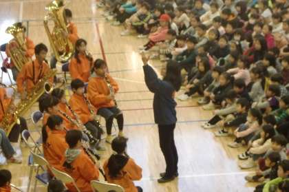 全校朝会で、本校の吹奏楽団の演奏の披露がありました。。