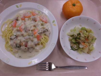 クリームソーススパゲティ・牛乳・ごぼうチップサラダ・くだもの