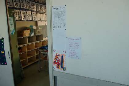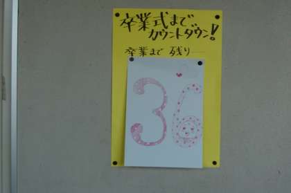 6年教室の廊下に掲示されています。「あと○○日」の裏には、クラスのみんなへのメッセージが書かれています。