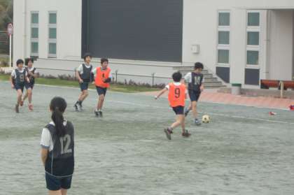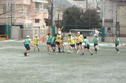 6年1組は体育。校庭でサッカーの試合をしています。寒い中でも元気です!