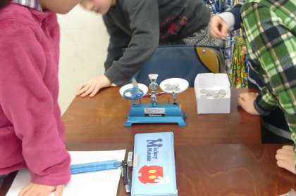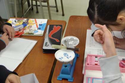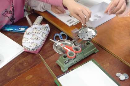 上皿てんびんばかりを使って、自分の身の回りのものが1円玉何枚分の重さなのか調べました。