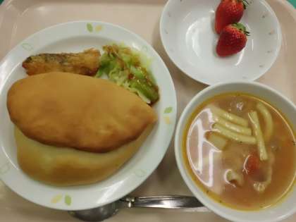 セルフフィッシュサンド・牛乳・ミネストローネ・くだもの