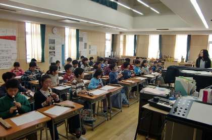 4年1組は第一音楽室で音楽。荒井由実の「ひこうき雲」をリコーダーで練習しています。「懐かしい!」と私が声に出したところ、「えっ?」という子どもたちの反応。映画「風立ちぬ」のおかげで、新しい歌ととらえているようです。