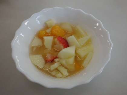 小さく切ったリンゴとイチゴにほかのフルーツも入れ、シロップをかけ完成です。