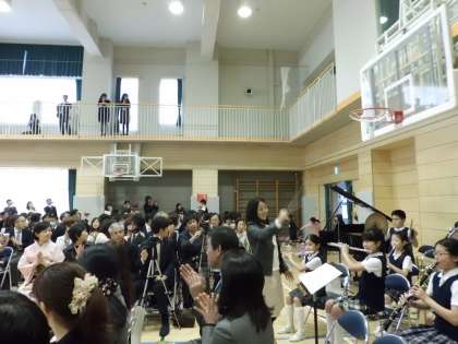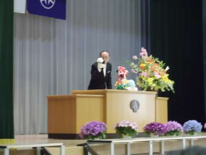 今回、初めて本校の吹奏楽団が入学式に参加しました。1年生の入場の伴奏「さんぽ」を演奏しました。校長先生のお話はパペットが登場する楽しい内容でした。