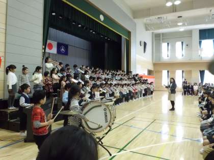 6年生の代表の言葉に続いて2年生の歓迎の言葉と演技、演奏がありました。