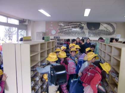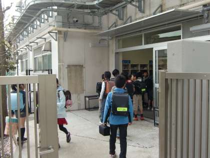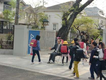 正門では校長先生と登校してくる子どもたちが握手をしています。