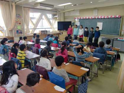 お世話になった6年生にお礼を言ってクラス、「1年生を迎える会」で歌う歌の練習をしているクラスがありました。
