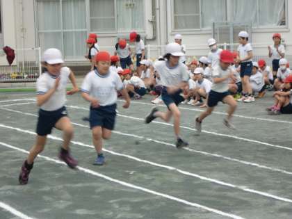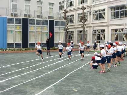 4年1組と2組は運動会に向けて、50メートル走のタイムを計っています。