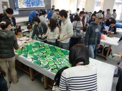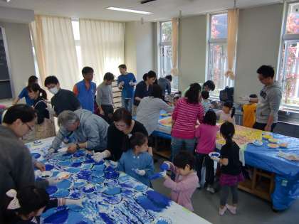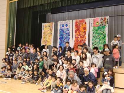4月19日(土)午前10時半から本校体育館と図工室でおやじの会主催のイベント「1年生歓迎会」が行われました。図工室でこいのぼりの模様を親子で描いた後、焼きそばを食べ、最後に出来上がったこいのぼりの前で記念撮影をしました。このこいのぼりは仙川のせきれい橋に明日飾る予定になっています。